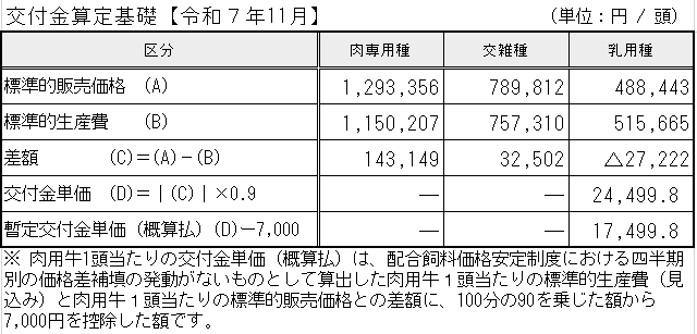 令和7年度11月交付金単価(牛マルキン)